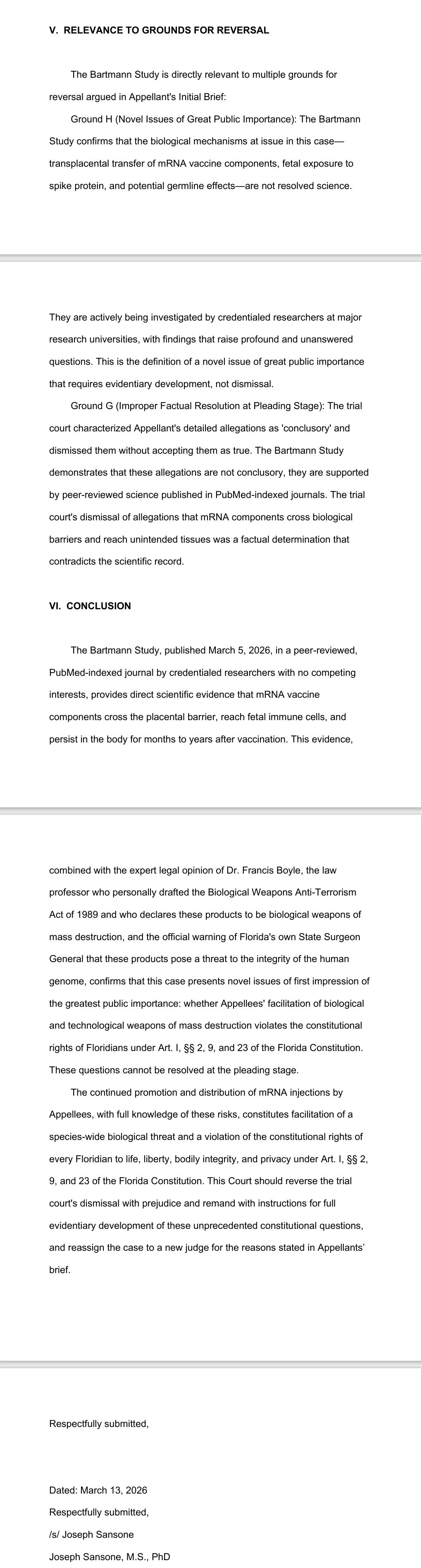 The Bartman et al study ‘Detection of spike protein in term placentas of COVID-19 vaccinated and/or SARS-CoV-2 infected women’, was filed as a Supplemental Authority in the Sansone V. DeSantis, Uthmeir, mRNA Bioweapons Case.