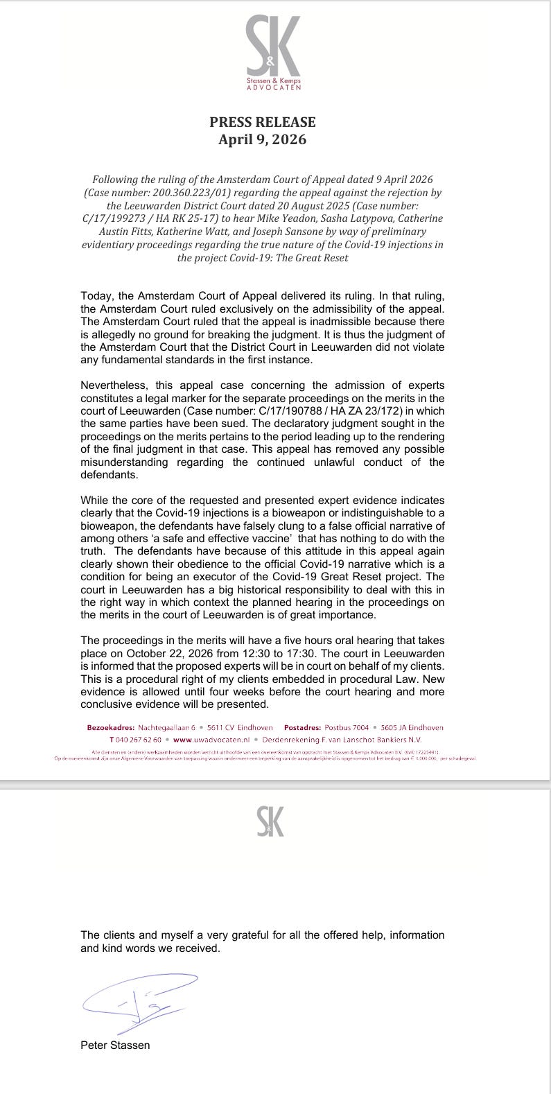 Breaking: Netherlands Court Dismissed Appeal in Bill Gates, Albert Bourla, Genocide and Bioweapons Case. Hearing on the Merits Set for October 22, 2026.
