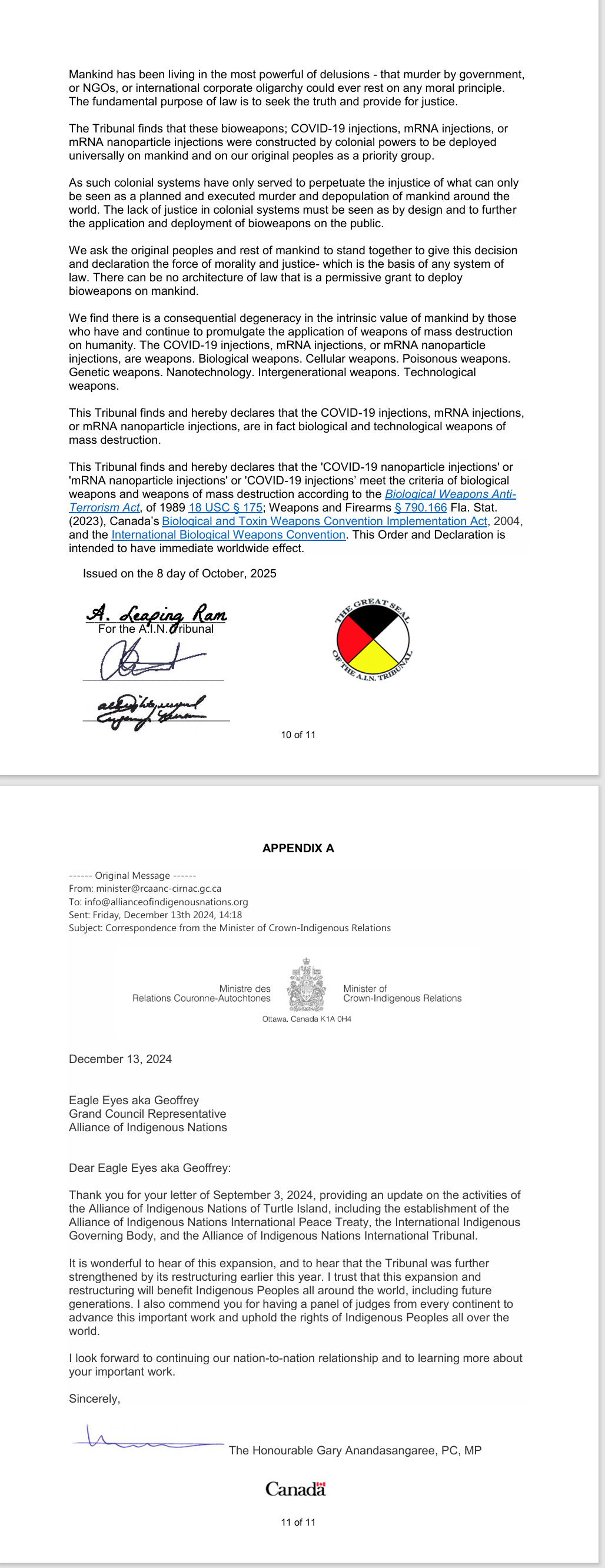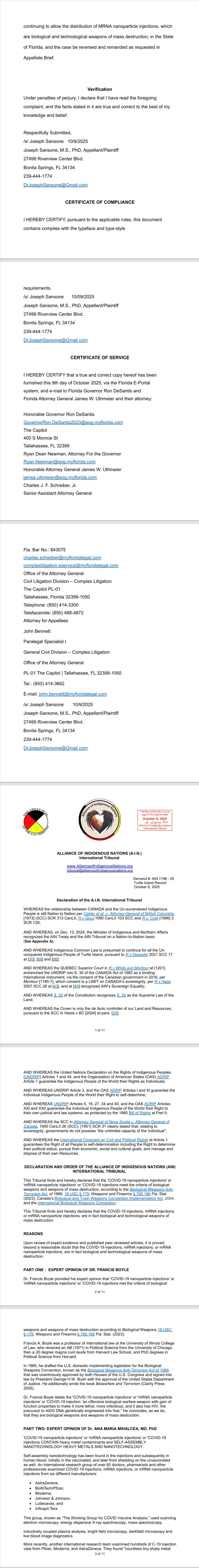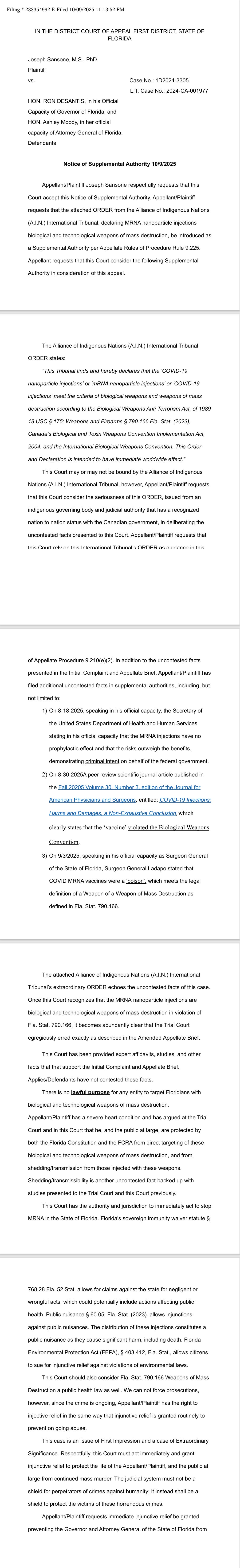 Last night I filed an ORDER dated 10/8/2025 from the Alliance Of Indigenous Nations (A.I.N.) International Tribunal stating that MRNA nanoparticle injections are biological and technological weapons of mass destruction as filed as a supplemental authority in my case in Florida’s First District Court of Appeal. This ORDER can be read here.