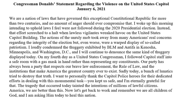 On January 6th, after the Government’s false flag operation, Donalds issued this statement:
