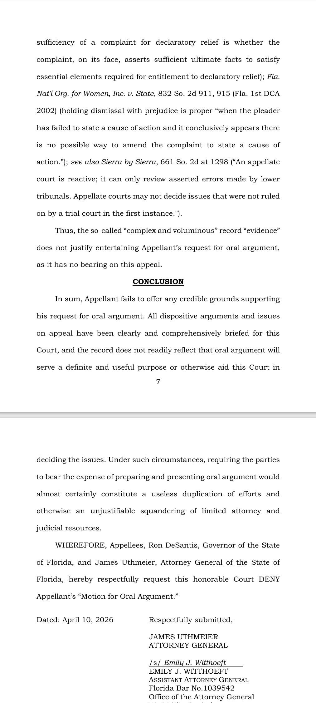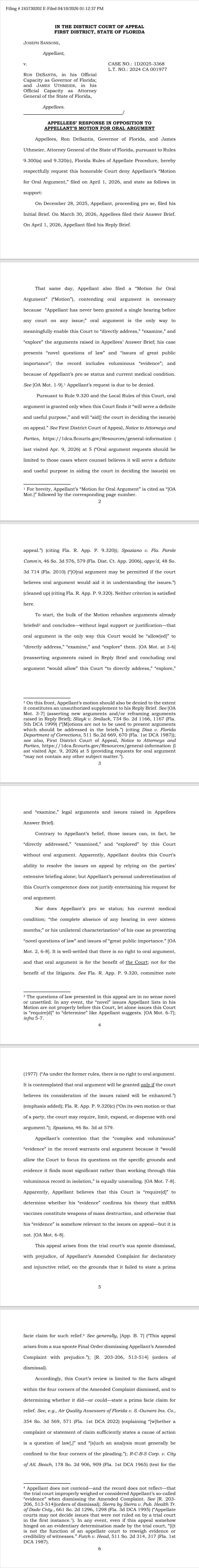 Governor Ron DeSantis and Attorney General James Uthmeier filed a Response through their attorney in Opposition to Oral Argument today in the Sansone V. DeSantis mRNA Bioweapons Case. This was a response to Dr. Joseph Sansone’s Request/Motion for Oral Argument.