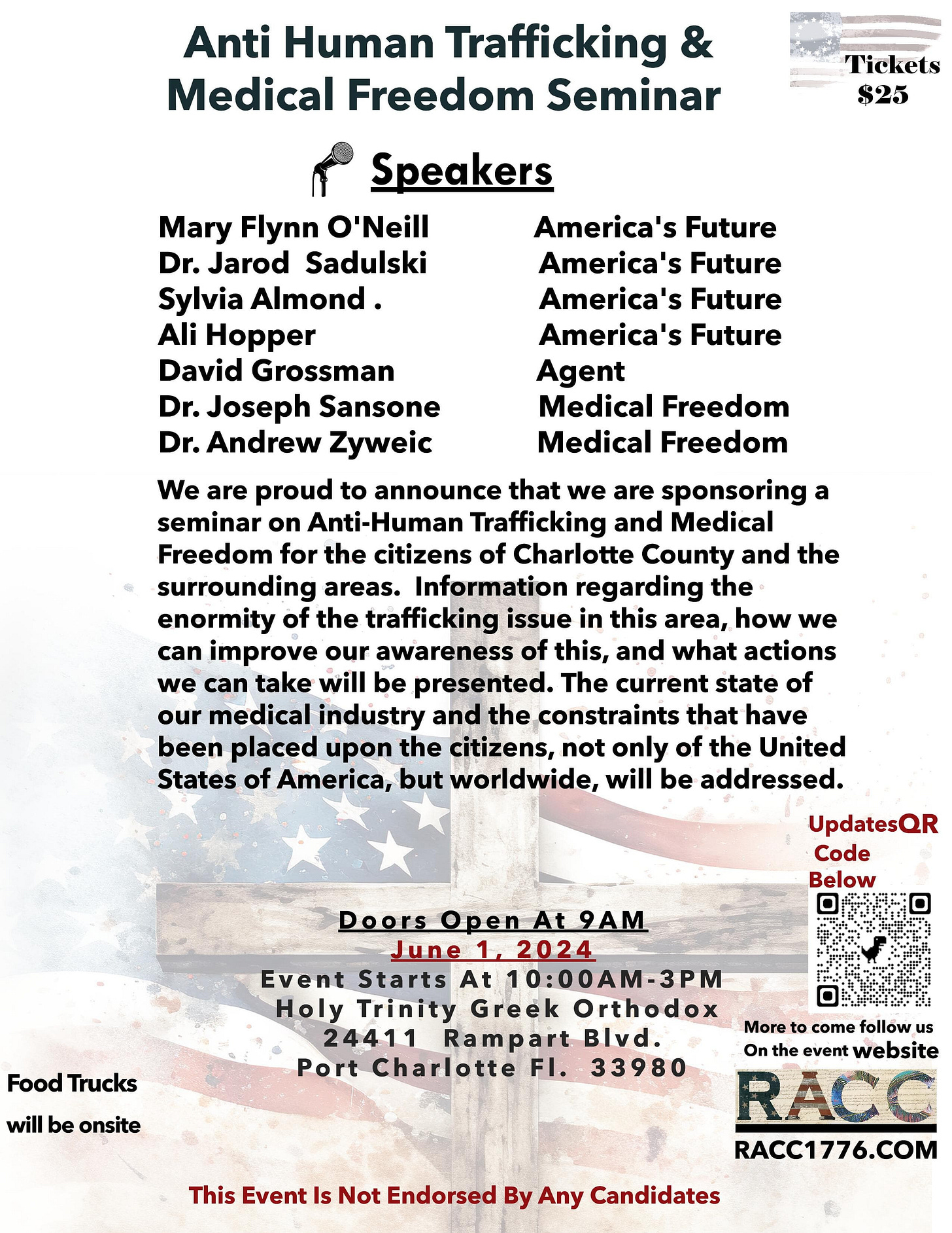 I’ll be speaking at an Anti Human Trafficking and Medical Freedom Seminar in Port Charlotte Florida on Saturday June 1st. I’ll be speaking on Medical Freedom. If you are in Southwest or Central Florida, come on by. I think you may still be able to get tickets to this event. Click this link or the image below to get a ticket.