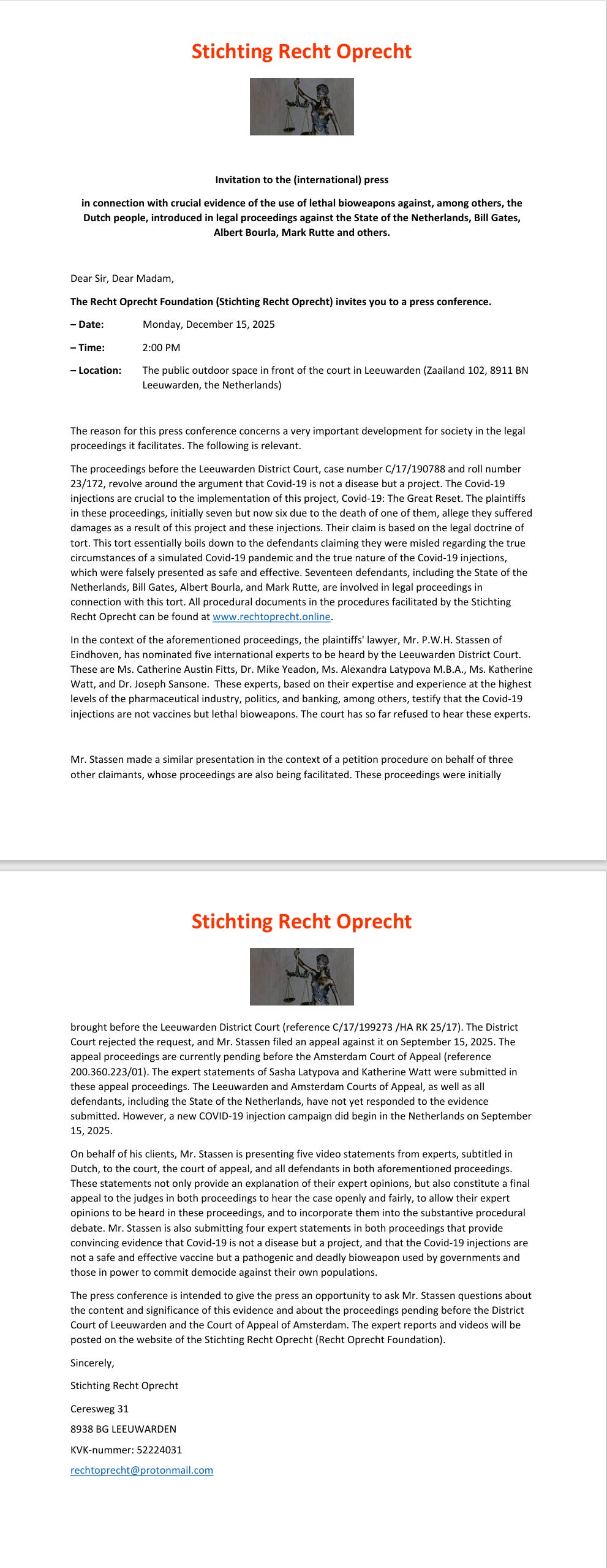The legal team asked us to distribute this press invitation for the international press conference taking place in Netherlands in front of the court in Leeuwarden on Monday December 15, 2025, at 2PM. The Plaintiffs’ Attorney Peter Stassen will be speaking about important developments in the case.