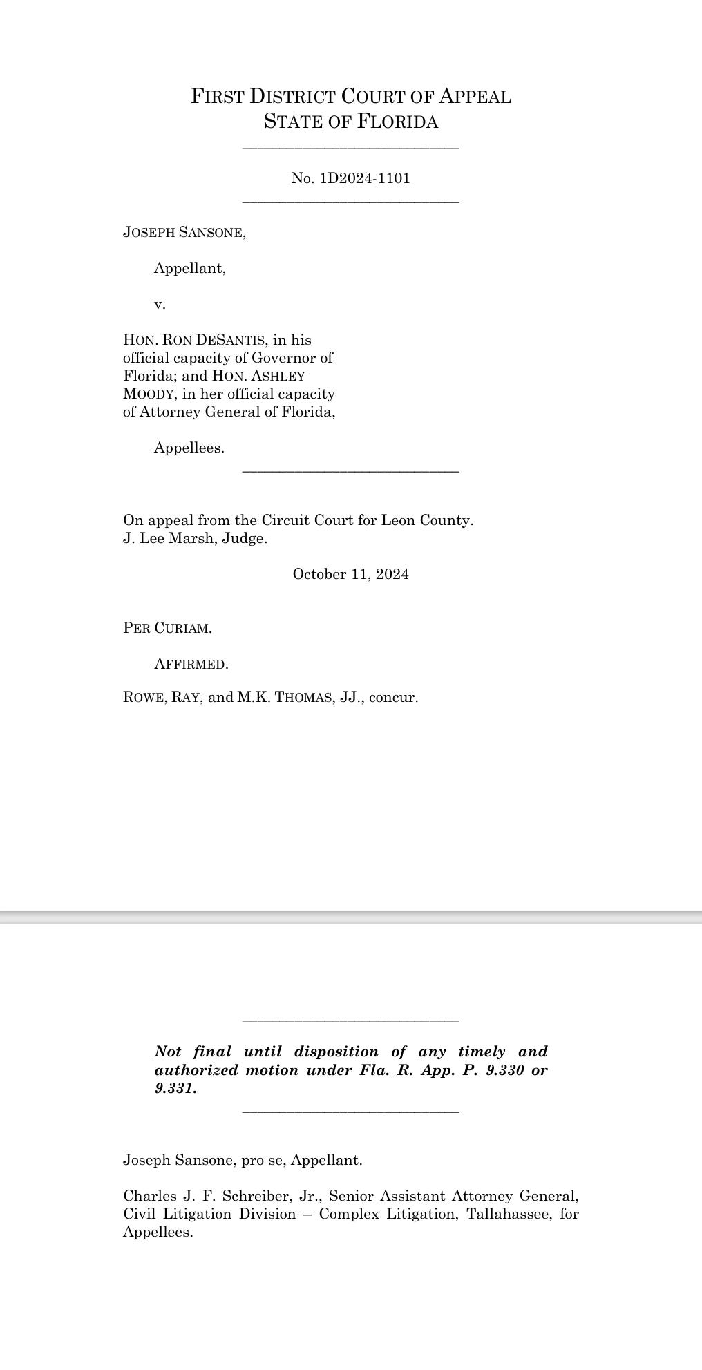 On October 11, 2024, the First District Court of Appeal denied my appeal regarding my writ of mandamus. Unfortunately, they stamped it per curium affirmed. PCA is actually a systemic injustice in the Florida Court system. This means the Appellate Court did not write a decision, and it is a way of blocking an appeal to the State Supreme Court since there is no decision for the Supreme Court to review.