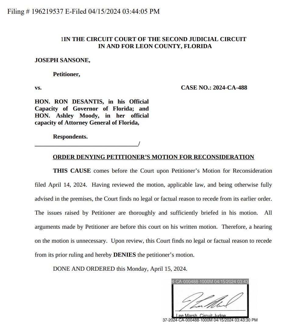Motion to reconsider denied. This was in response to this motion for reconsideration. Working on my motion for a rehearing.