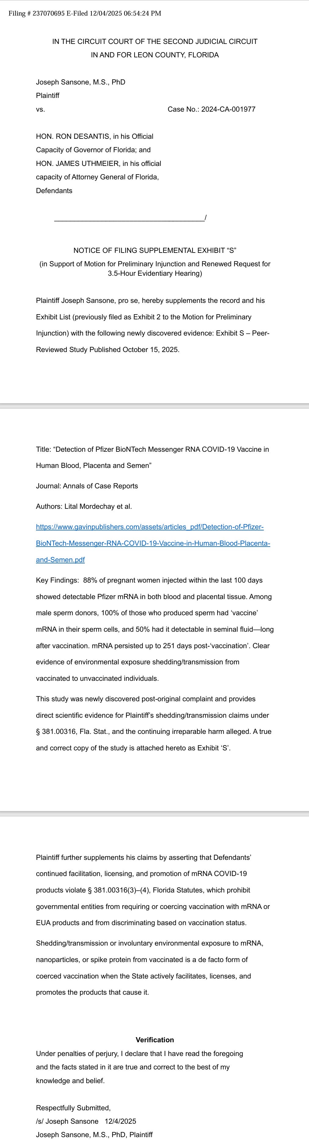 I filed my initial Complaint on December 1, 2024 seeking an injunction to prohibit the distribution of mRNA injections in Florida because they violate Fla. Stat. 790.166 Weapons of Mass destruction. I also sought Declaratory Judgements from the Court. The case was dismissed prematurely and I appealed. Case is currently in FL 1DCA.