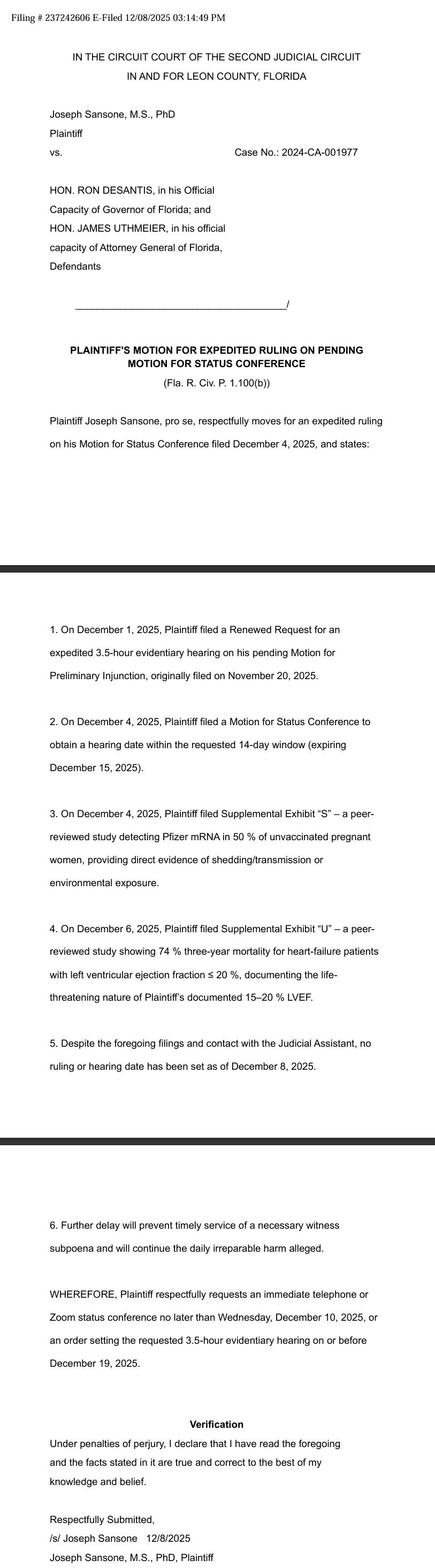 On December 4, 2025, I filed a Notice of Supplemental Exhibit S - Shedding Study. I also introduced a new legal argument that the shedding or environmental exposure constitutes forced or coerced MRNA in violation of Florida’s recent health freedom law prohibiting that.
