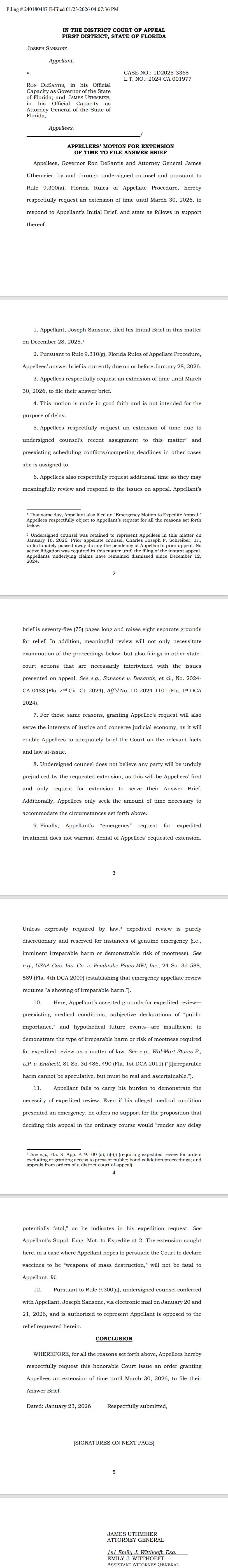 Sansone V. DeSantis MRNA Bioweapons Case: DeSantis's Attorney Asks for an Additional 60 Days to File an Answer Brief!