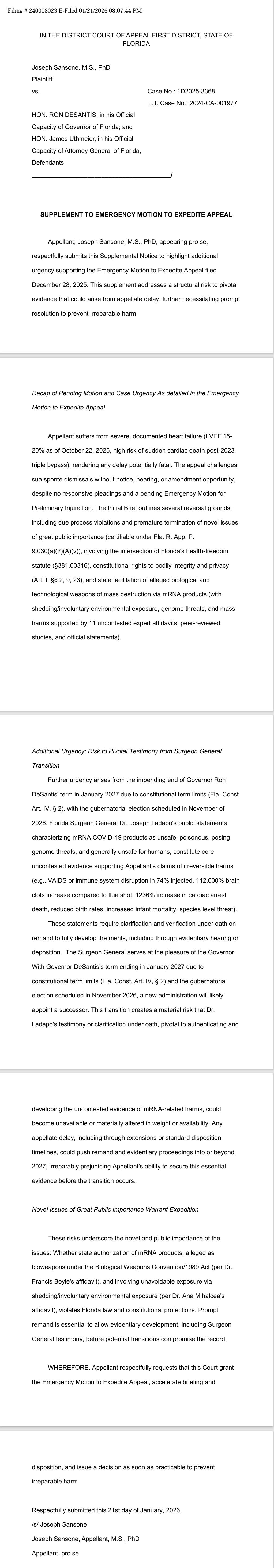 Sansone V. DeSantis MRNA Bioweapons Case: Supplement to Motion to Expedite Appeal