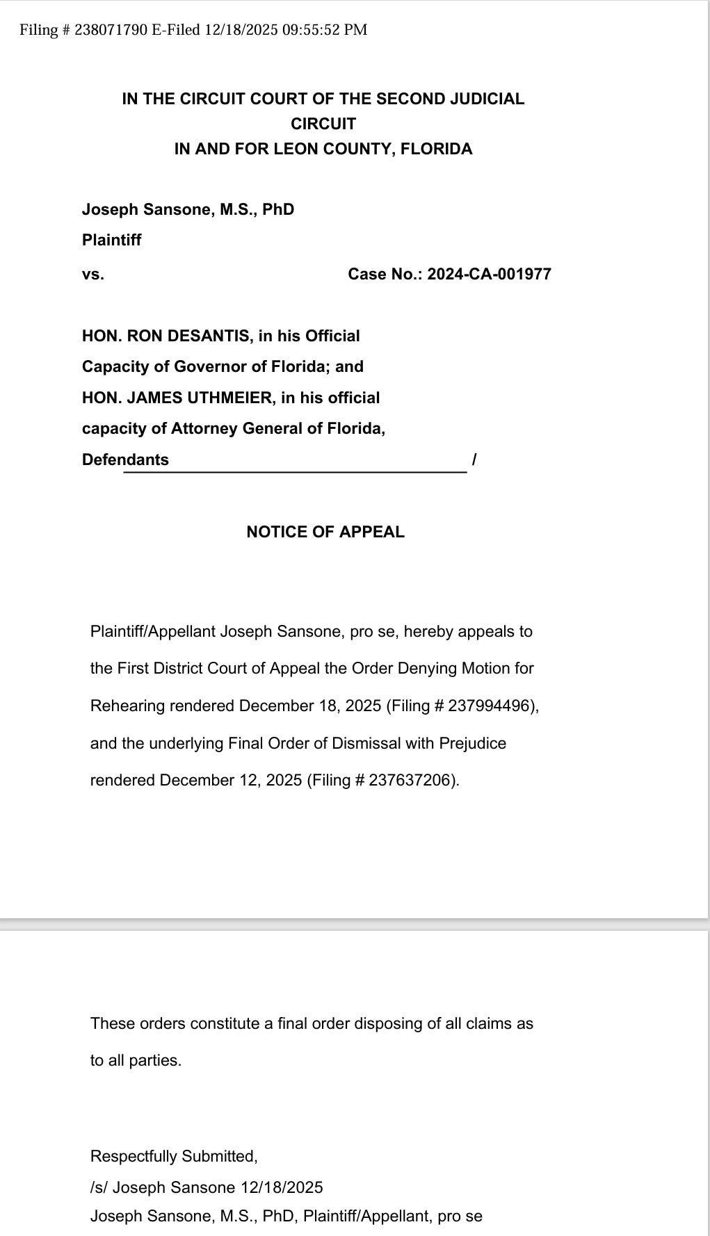 Sansone vs. DeSantis mRNA Bioweapons Case, Notice of Appeal Filed.