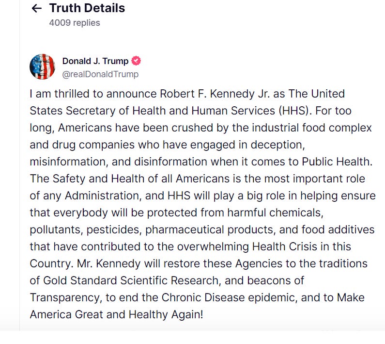 Trump Appoints Robert Kennedy Jr. as Secretary of Health and Human Services. (HHS). Keep an eye on that Pfizer and Moderna stock…..