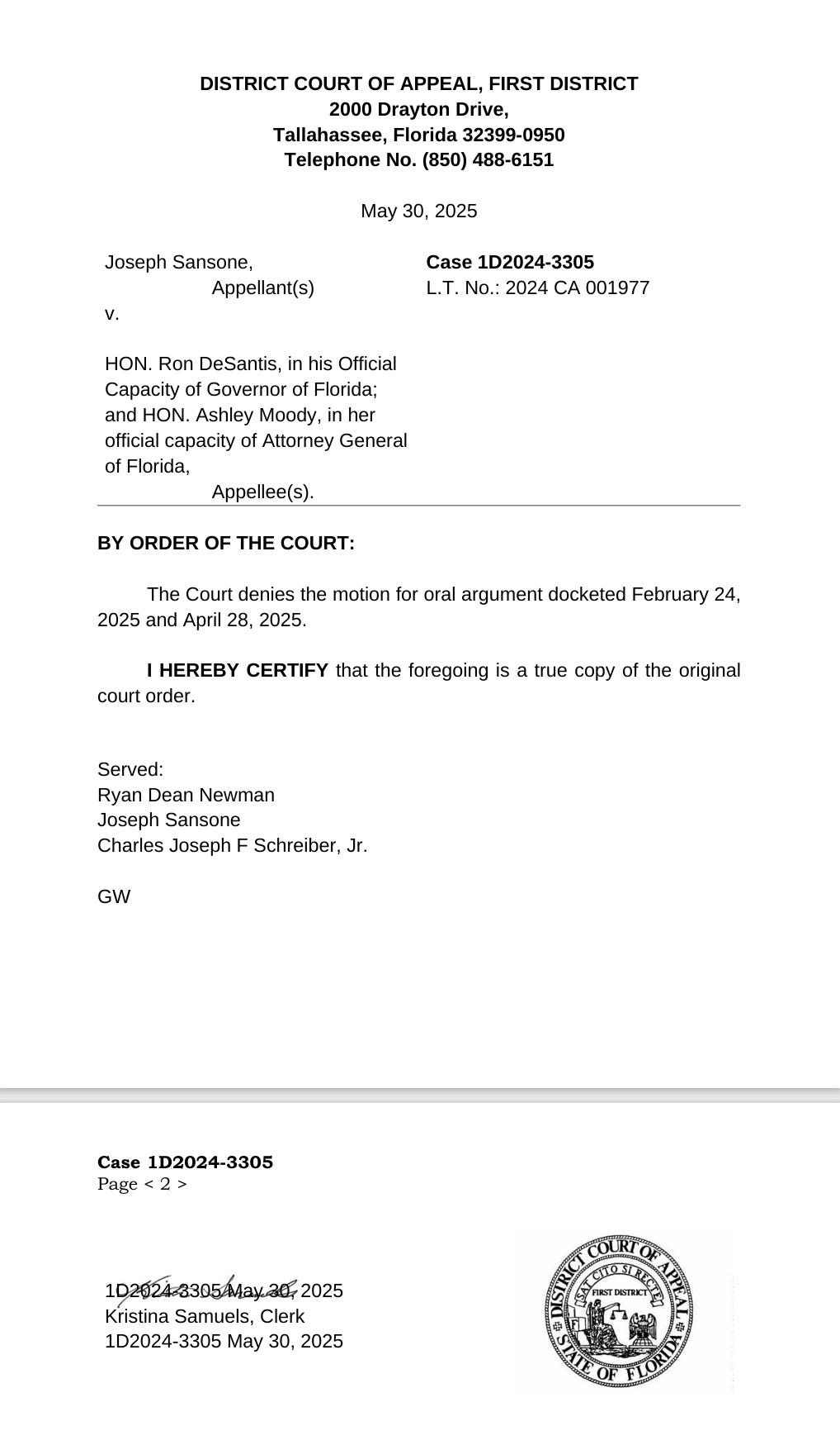 I received an ORDER yesterday from Florida’s First District Court of Appeals denying my Motion for Oral Argument that was filed on 4/26/2025. This is not entirely unexpected. Granting Oral Argument in an appeal is discretionary and the Appellees/Defendants, Governor Ron DeSantis and the Attorney General James Uthmeier, did not file an Answer Brief in the Appellate Court and therefore would not participate in Oral Argument.